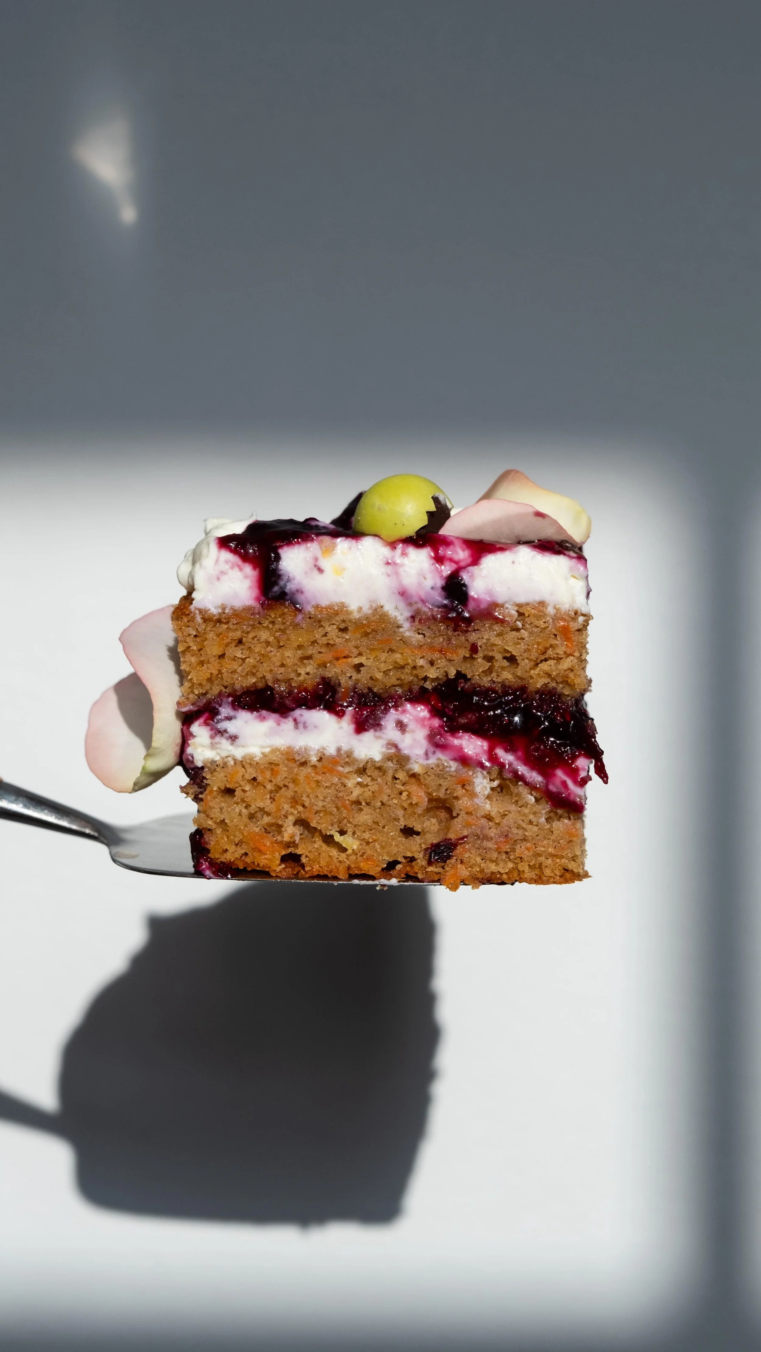 Påskekage med bærkompot, vaniljecreme, knuste påskeæg og blomsterblade