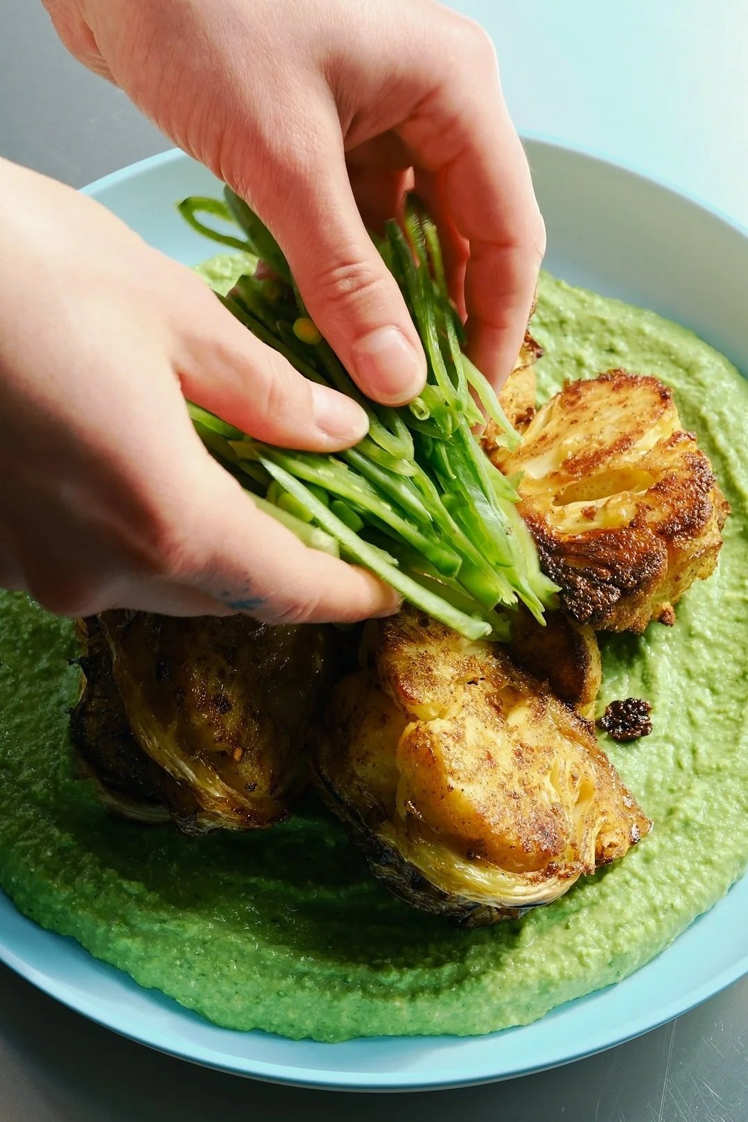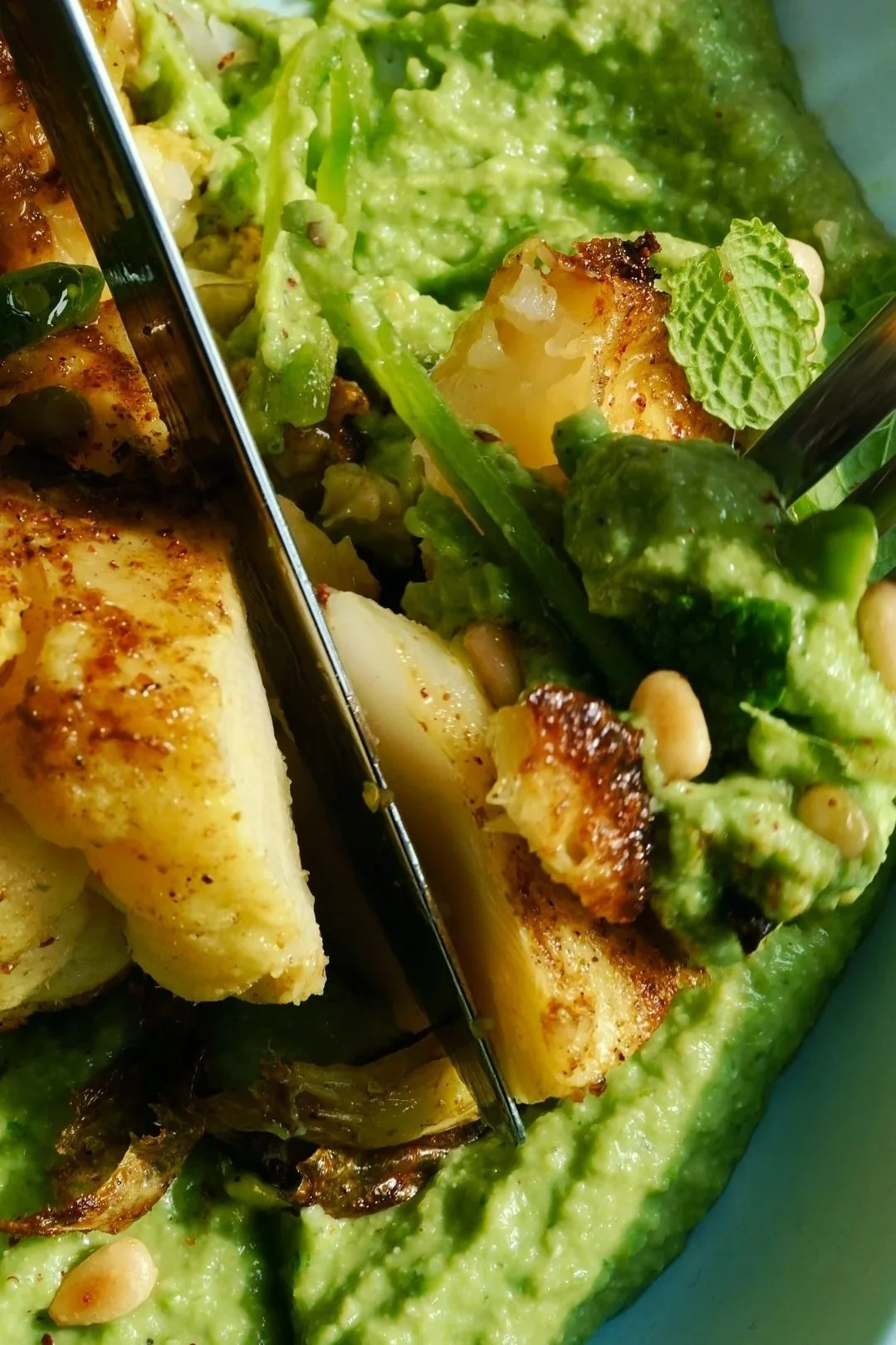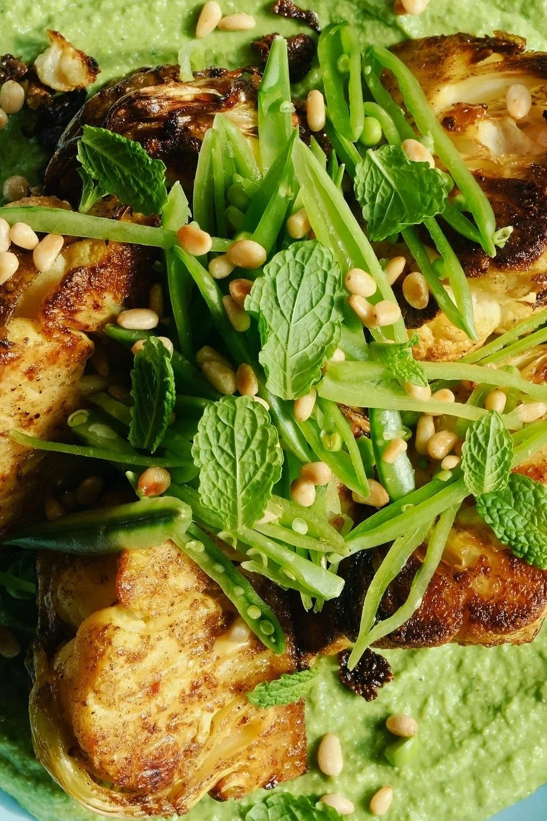 Bagt, krydret blomkål med ærtecreme, sukkerærter og ristede pinjekerner