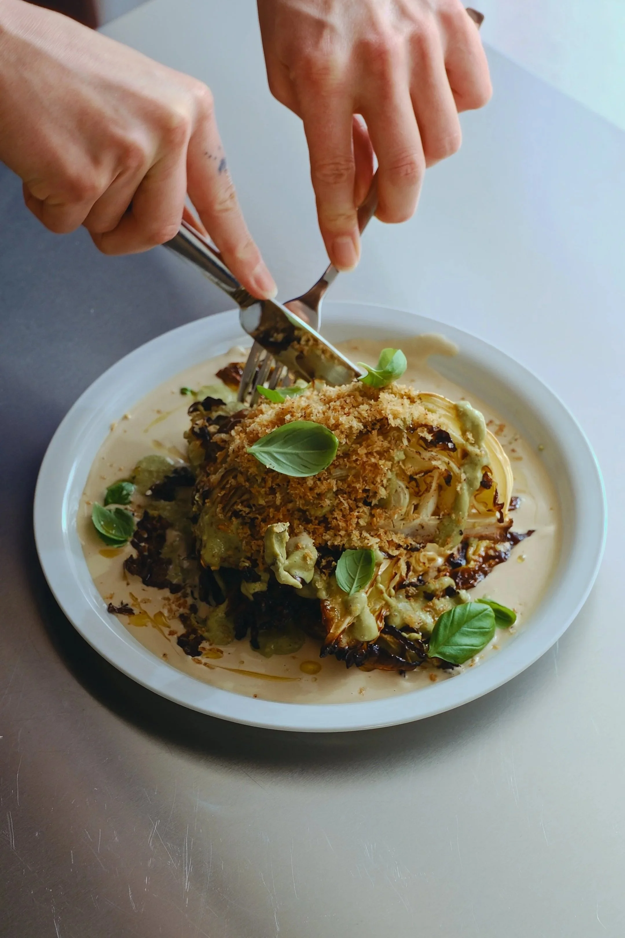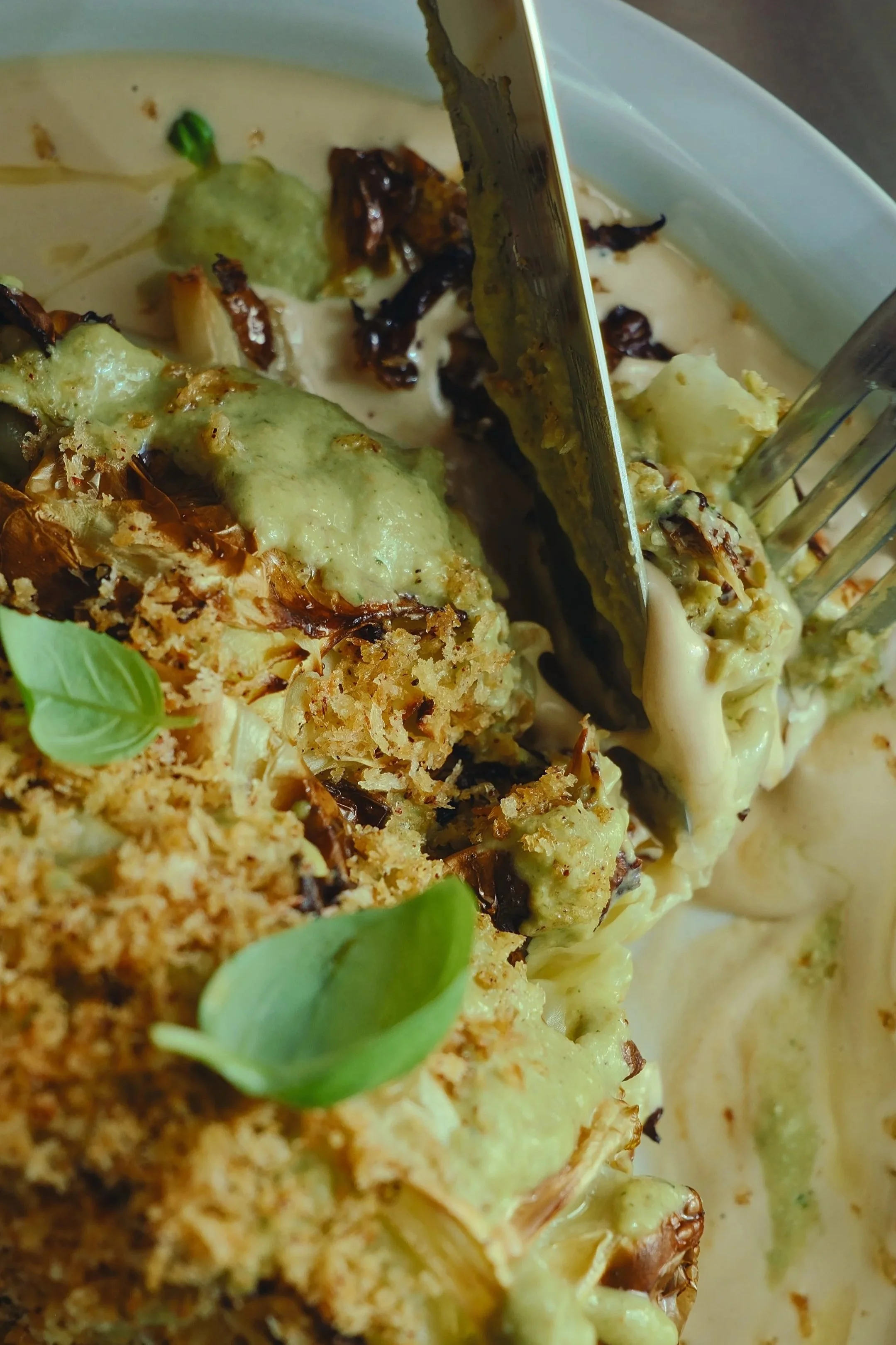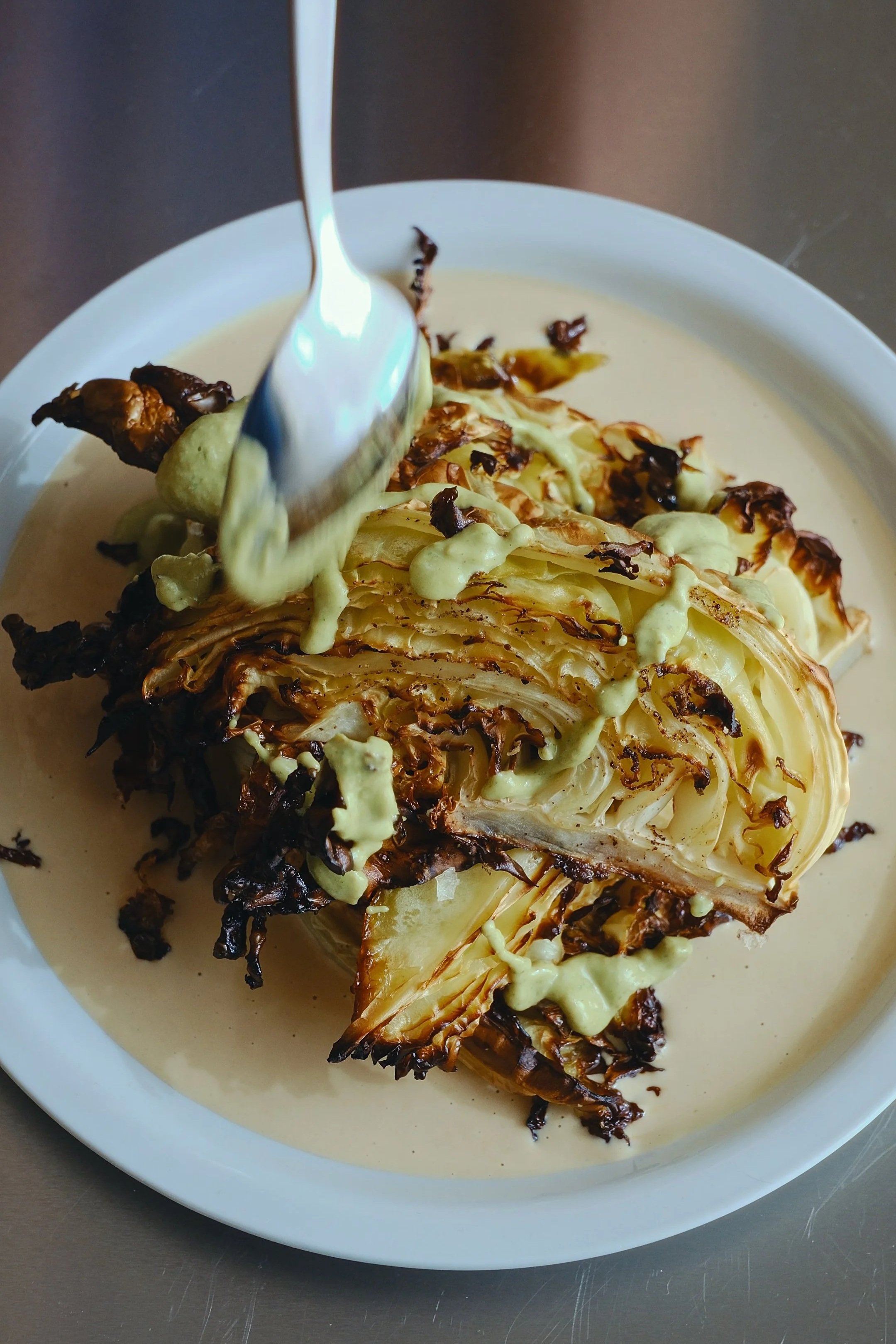 Den her opskrift på bagt spidskål med tahinsauce, pesto og sprød topping smager vidunderligt! Retten fungerer lige så godt som vegetarisk hovedret som et elegant tilbehør. Opskriften kombinerer enkle råvarer med stor smagsdybde og er et godt eksempel på, hvordan kål kan forvandles til noget både mættende og raffineret.