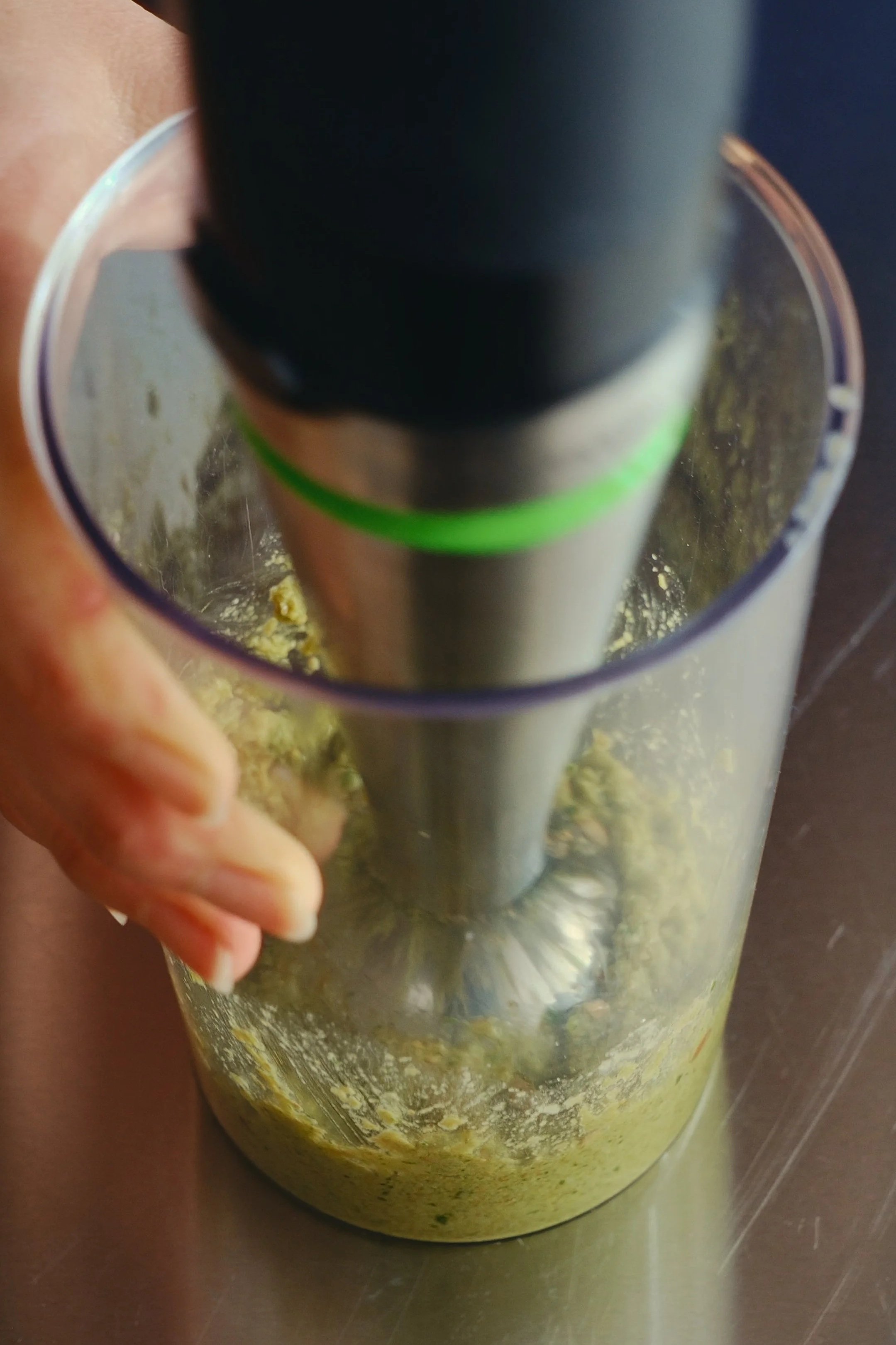 2. Lav i mellemtiden tahinsauce, lyn-pestoen og toppingen.