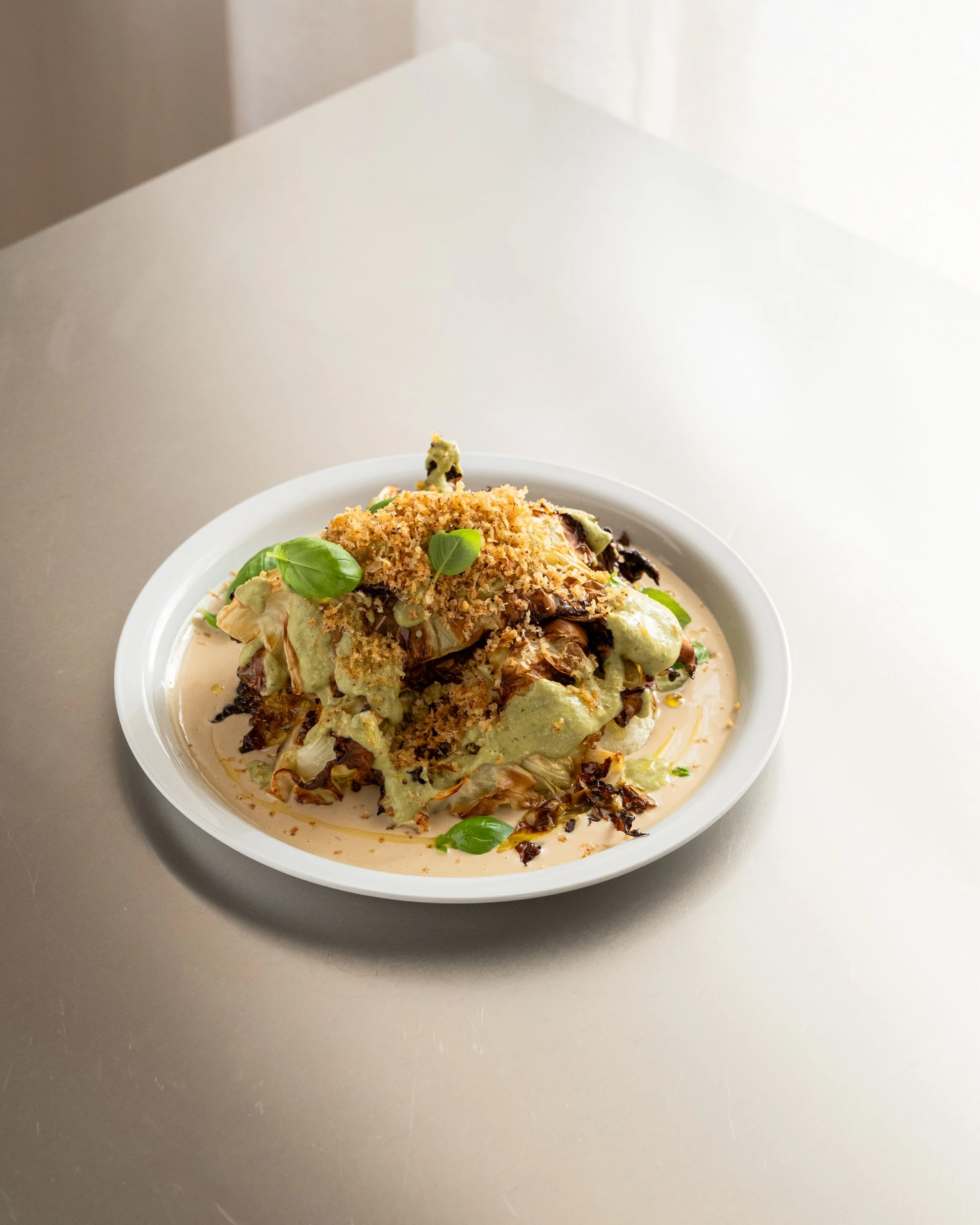 Til sidst toppes retten med en sprød topping af pankorasp, sumak og et strejf chili. Den giver kontrast til de bløde elementer og tilføjer både knas, syrlighed og et diskret krydret præg, der gør hver mundfuld mere interessant.