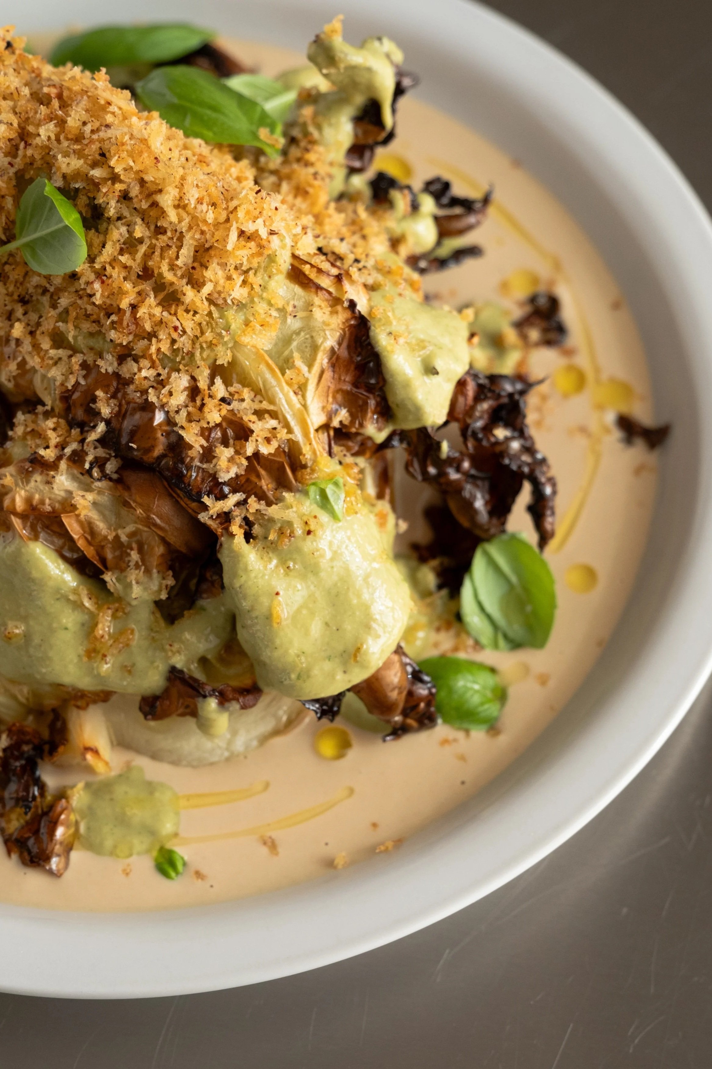 6. Smør så tahinsaucen ud på dit serveringsfad, anret de bagte stykker spidskål ovenpå og top med lyn-pestoen, pankoraspen og basilikumbladene og et lille drys olivenolie.