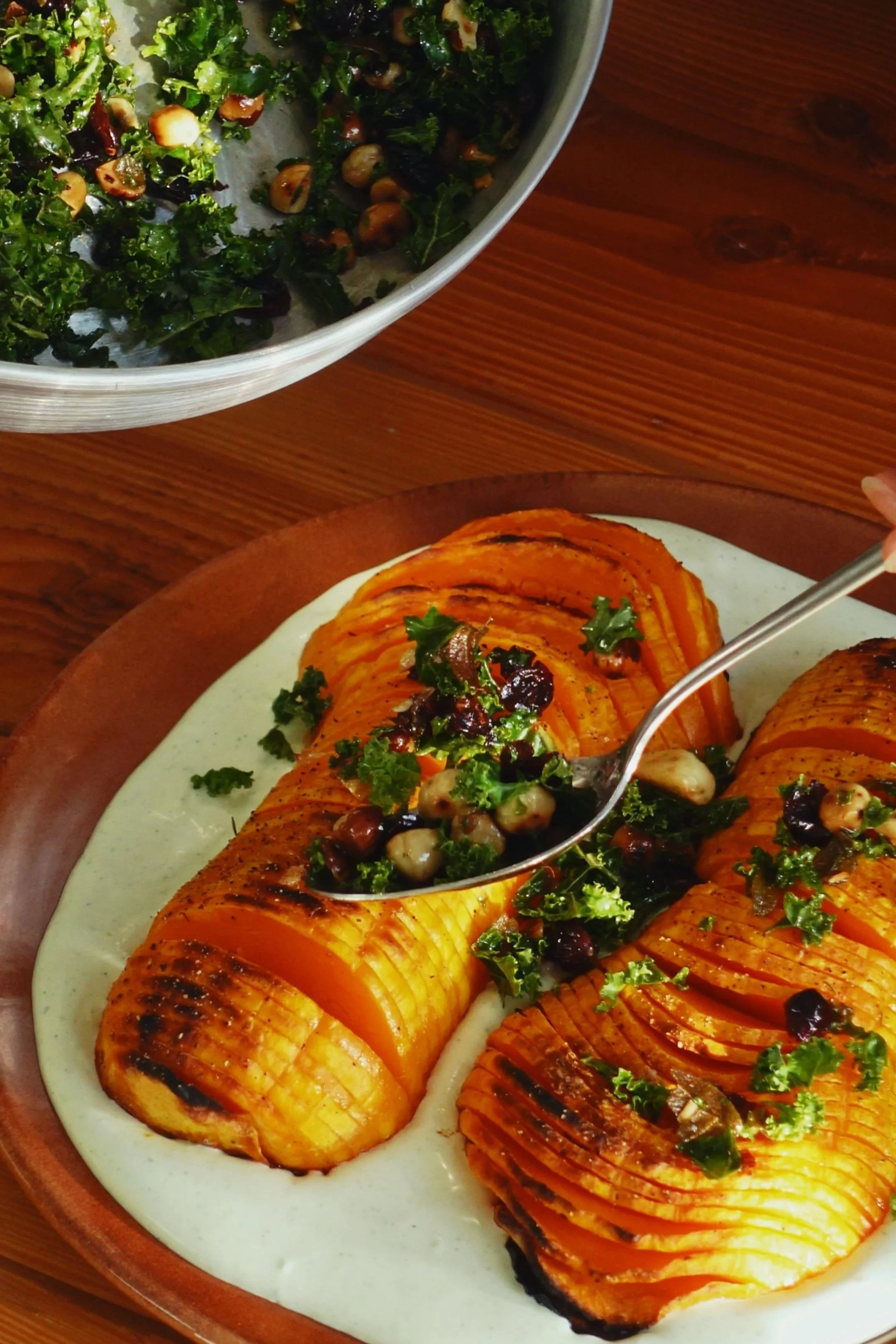 Hasselback butternut squash med feta-basilikumcreme og smørstegte hasselnødder med salvie og tranebær