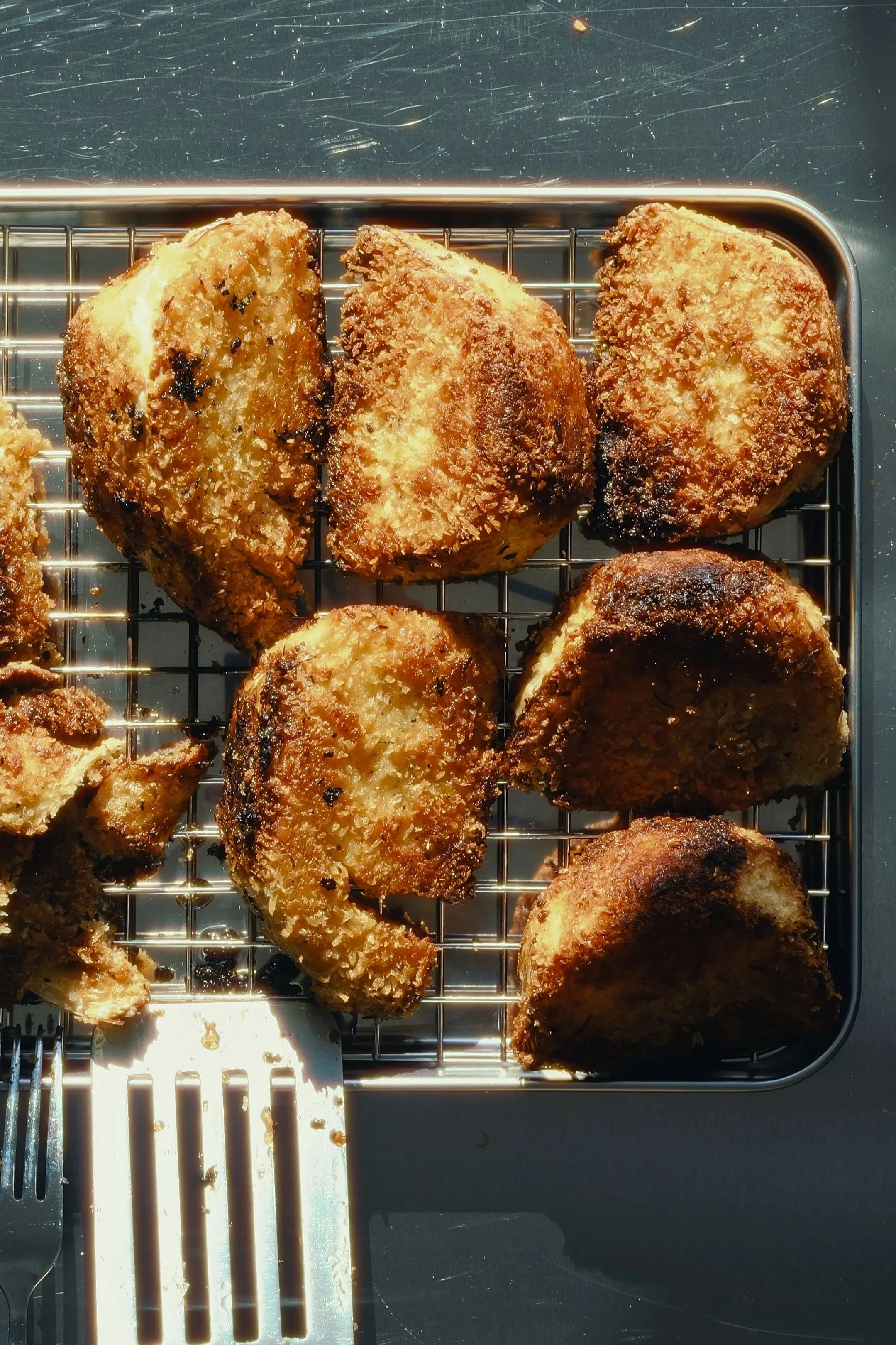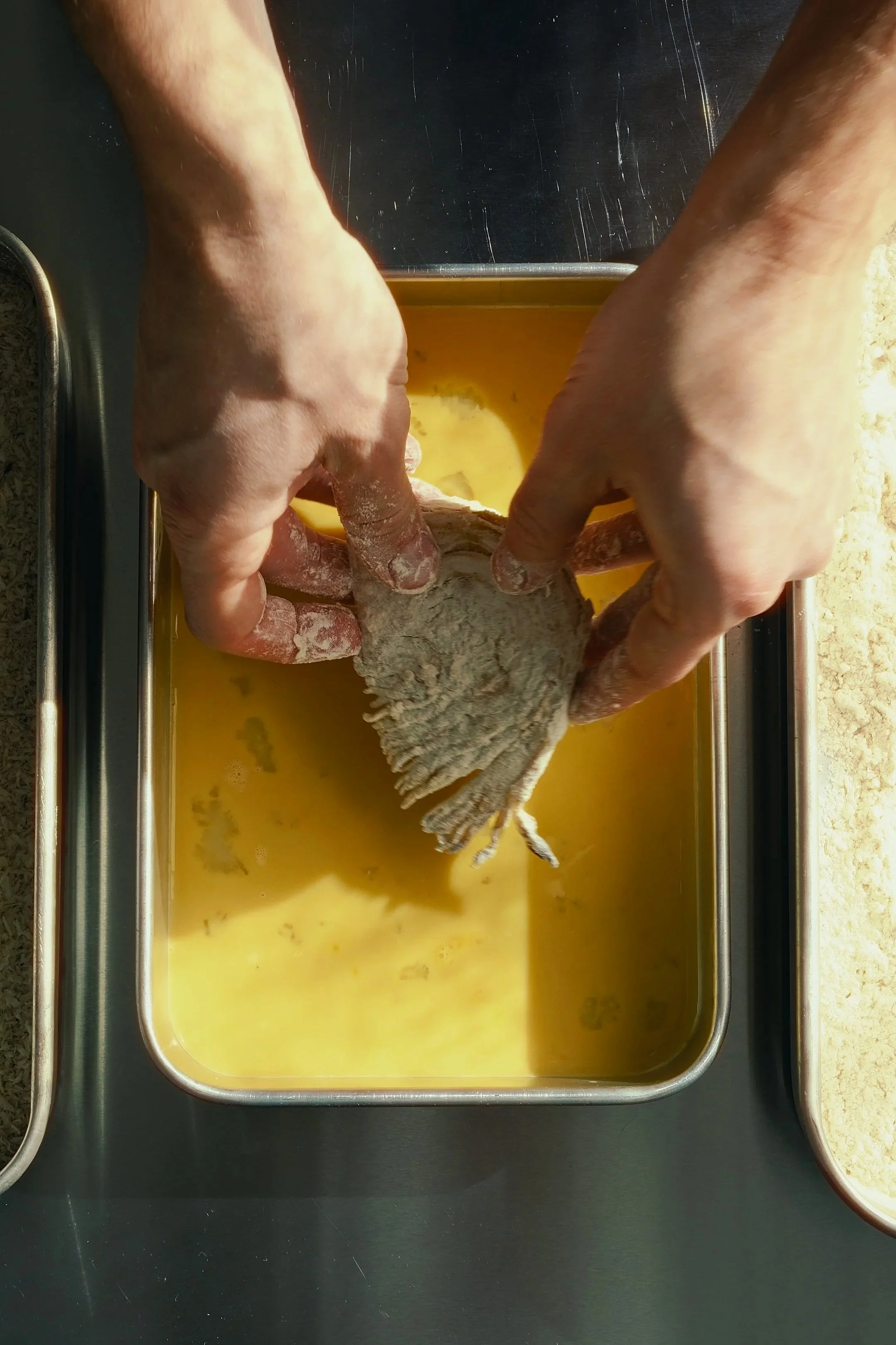 Kålen skæres i både og bages først i ovnen, til den bliver mør med let karamelliserede og næsten brankede kanter. Det fremhæver kålens naturlige sødme og giver en mør konsistens, som fungerer perfekt, når den senere paneres og steges sprød på panden. Paneringen består af en krydret melblanding, æg og panko, der giver et let og ekstra knasende lag omkring kålen.