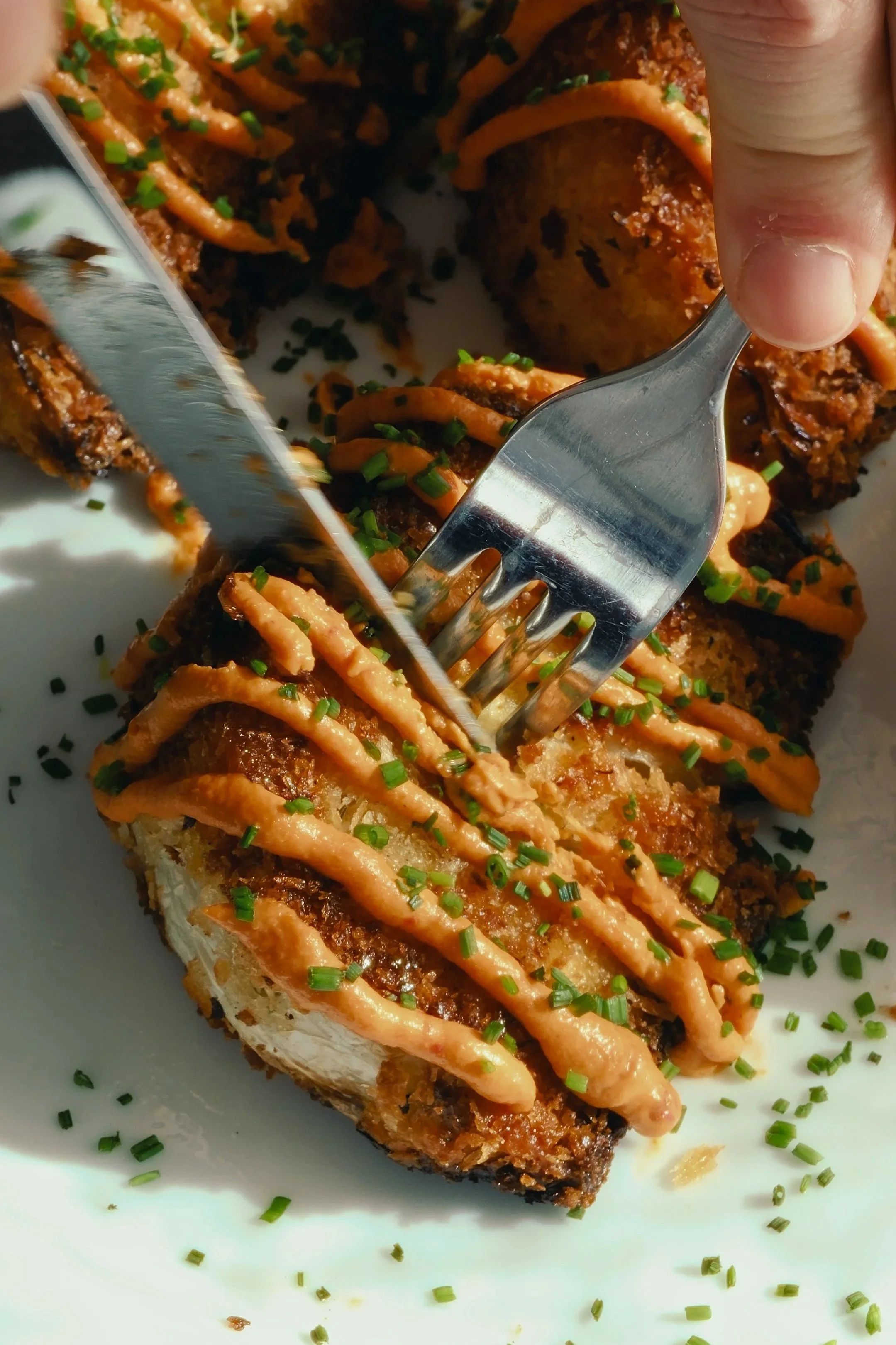 Paneret kål med en spicy sauce og purløg. En lækker og smagsmættet ret, hvor den ovnbagte kål får nyt liv gennem en gylden panering og en intens, cremet sauce. En oplagt opskrift, når du vil lave kål med masser af tekstur og smag – og hvor den milde grøntsag får et krydret og umamirigt modspil.
