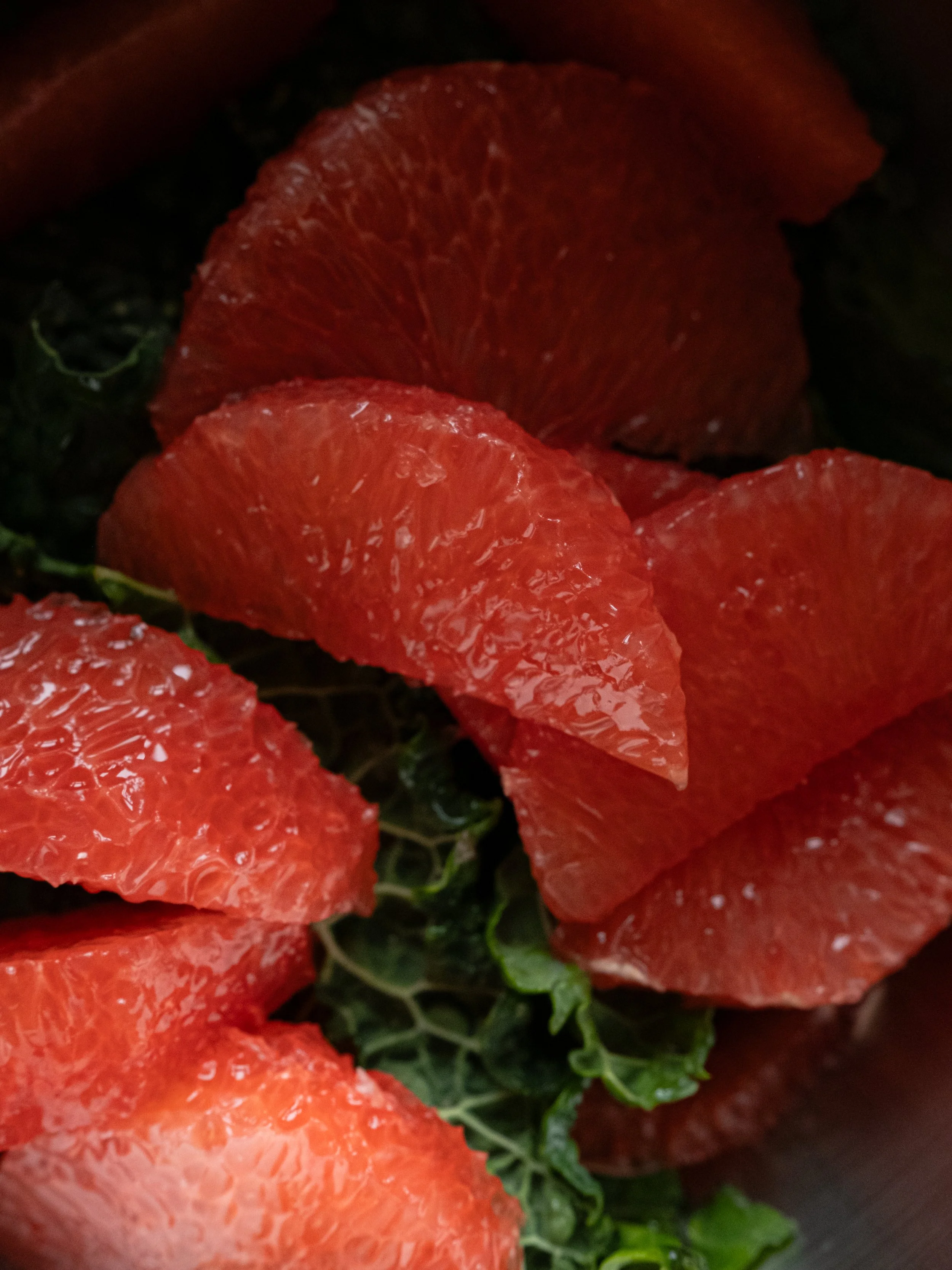 Den friske grape tilfører både saftighed og en klar citrusnote. De fileterede stykker giver små, syrlige smagsudbrud, mens skal og saft bruges i vinaigretten for at samle hele retten i en gennemgående grapefrugt-smag. Grapevinaigretten er balanceret med honning, olivenolie og mirin, som afrunder syren og giver dressingen en blød, let sødme med dybde.