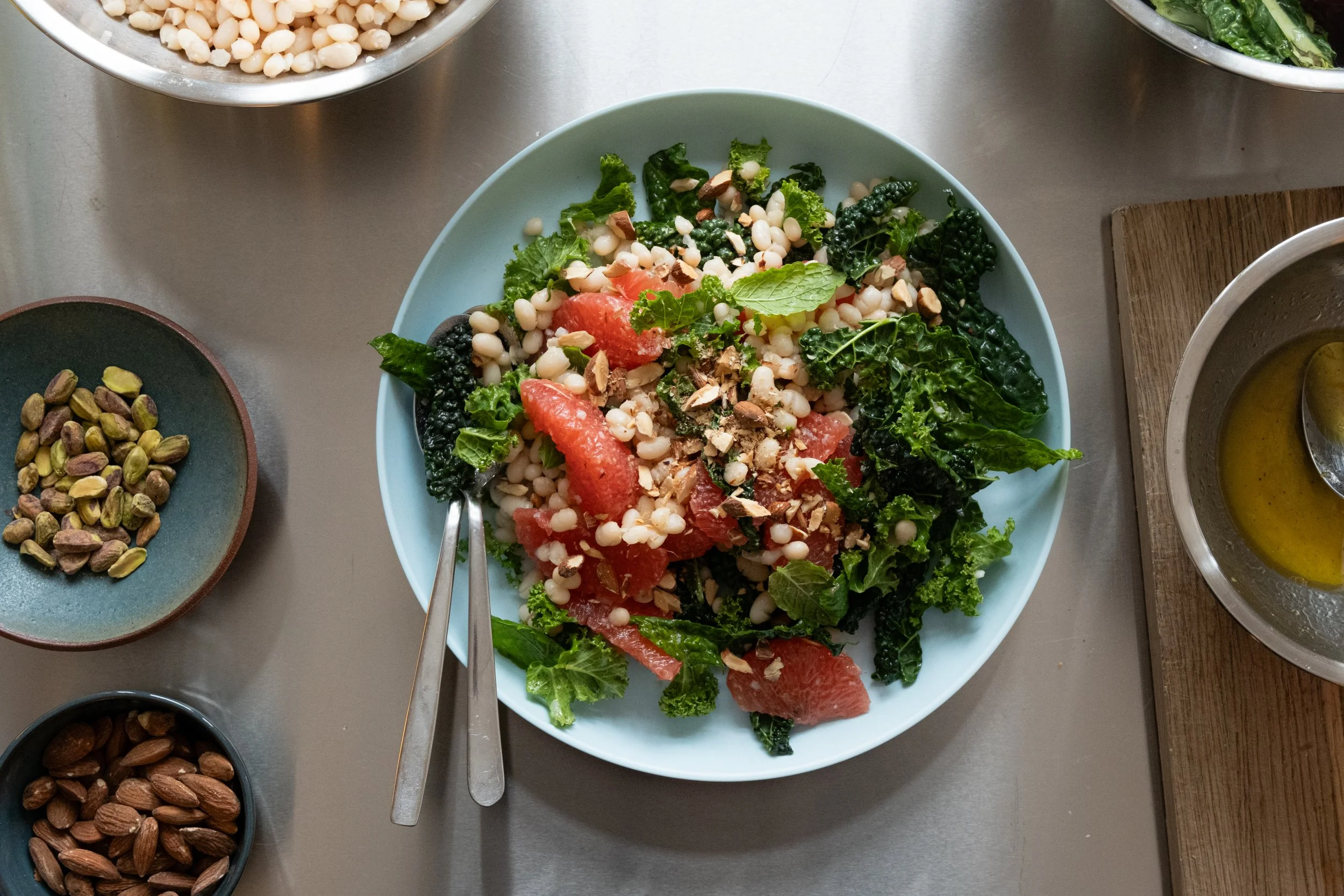 Hvide bønner bidrager med en mild, cremet konsistens, tilfører salaten et skønt proteinboost og gør den mere mættende, uden at den føles tung. De salte mandler tilfører sprødhed og et lille saltet modspil til citrus og kål, mens mynte giver et friskt, aromatisk løft, der gør salaten let og levende.