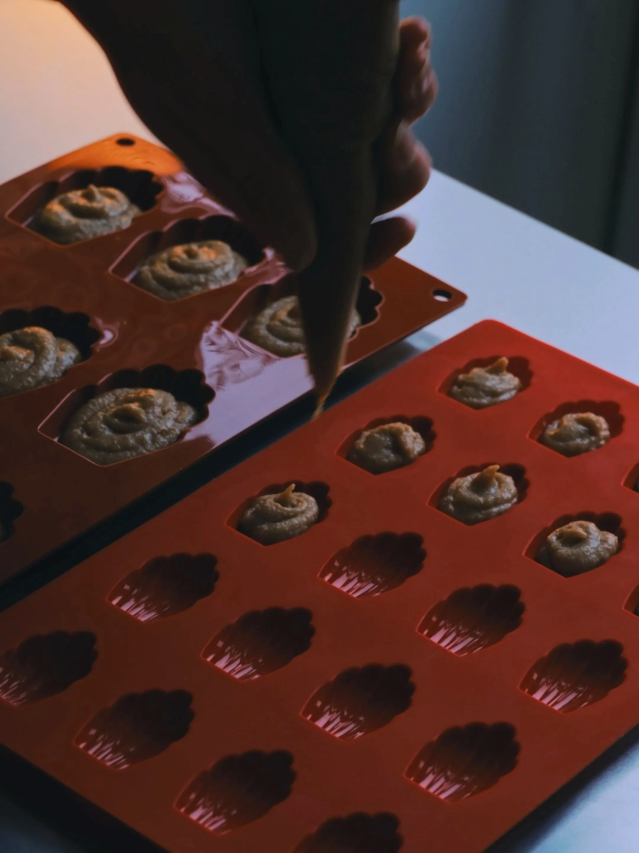 Det brunede smør er kagens smagsmæssige rygrad. Når smørret brunes, udvikler det dybe, nøddeagtige noter, som giver madeleinerne varme og kompleksitet uden at gøre dem tunge. Sammen med æggehviderne skabes en let og luftig krumme, der samtidig er saftig og blød. Kombinationen af sukker og brun farin tilfører både ren sødme og en afrundet karameltone, som klæder det brunede smør perfekt.