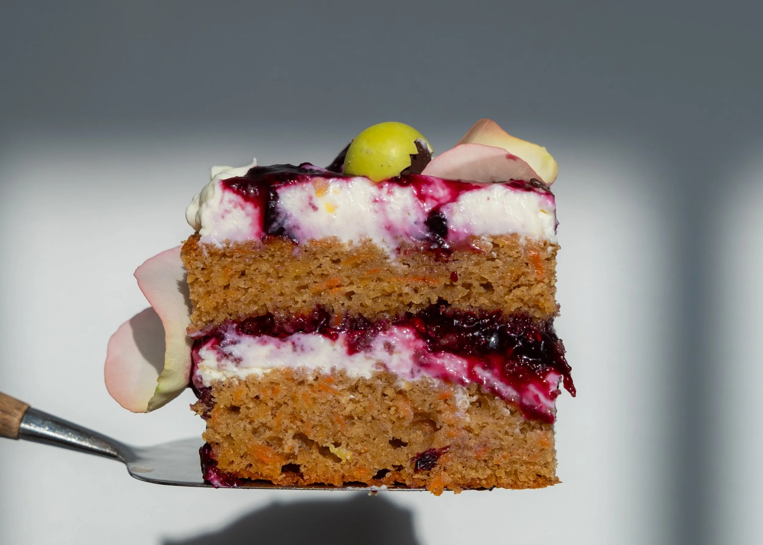 Bærkompotten koges hurtigt af solbær (hindbær eller blåbær) med lidt sukker og citronsaft. Den får en koncentreret, let syrlig smag, som bryder den søde kage og giver friskhed i hvert lag. Sammen med mascarponecremen – pisket let med vanilje, fløde og et strejf citrus – skaber den en blød og balanceret fyldning, hvor syre, sødme og fedme mødes.