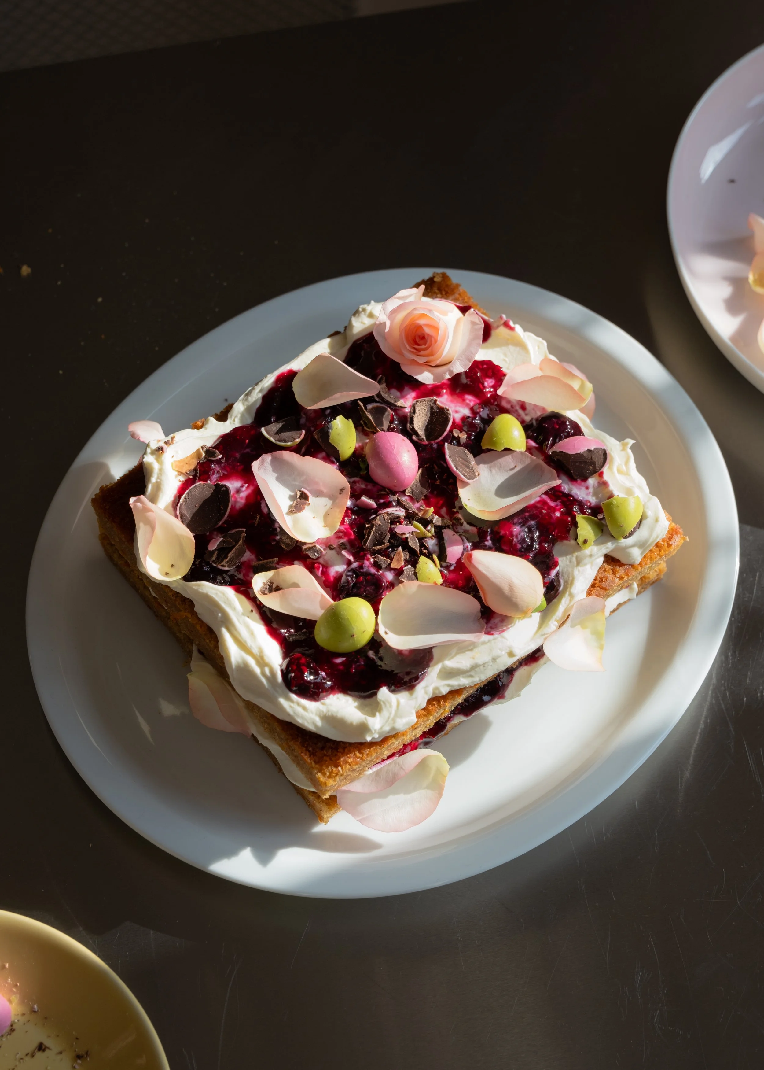 Når kagen samles, skæres den over i to bunde, som fyldes med både creme og kompot, så den får flere lag af smag og tekstur. Til sidst pyntes den med knuste dragé-chokoladeæg og lyserøde rosenblade, der giver både sprødhed og et dekorativt påskeudtryk.