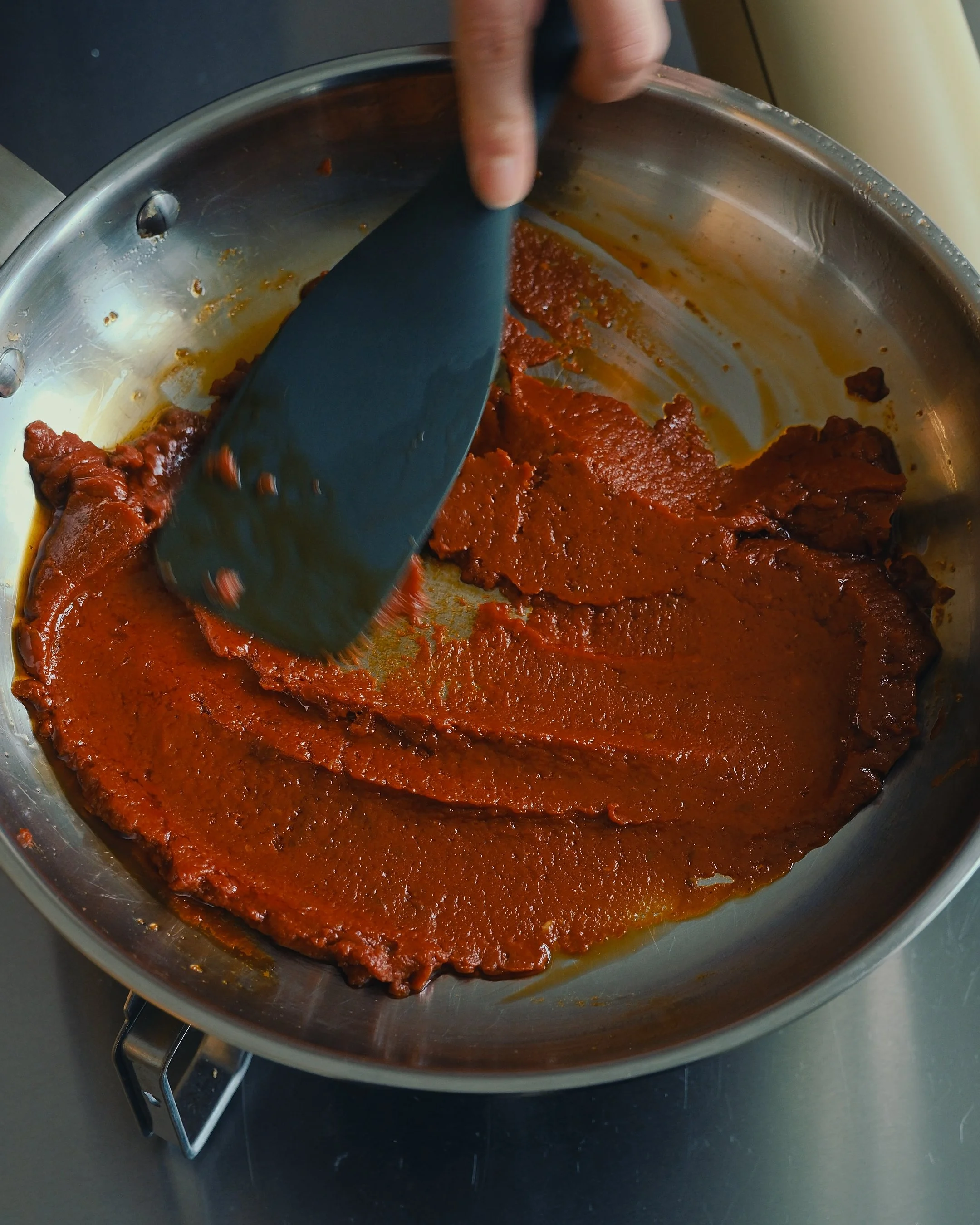 Stavblend ingredienserne til tomatpasten sammen og kom det på panden. Smør det ud til et jævnt lag på panden og steg det et minuts tid. Skrab det sammen og smør det jævnt ud igen og steg yderligere et minuts tid. Gentag dette i 7-8 minutter og kom det så tomatpasten i en skål.