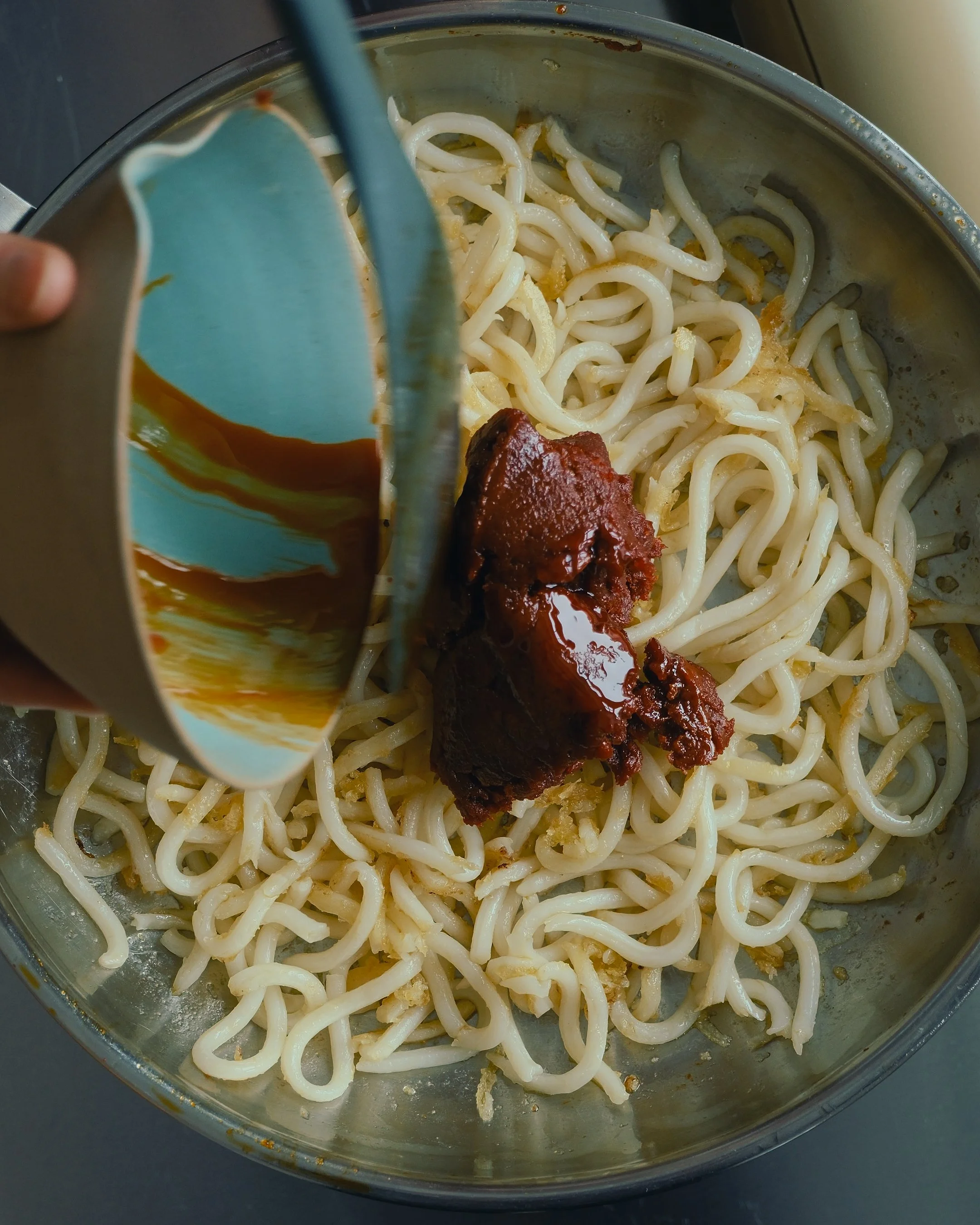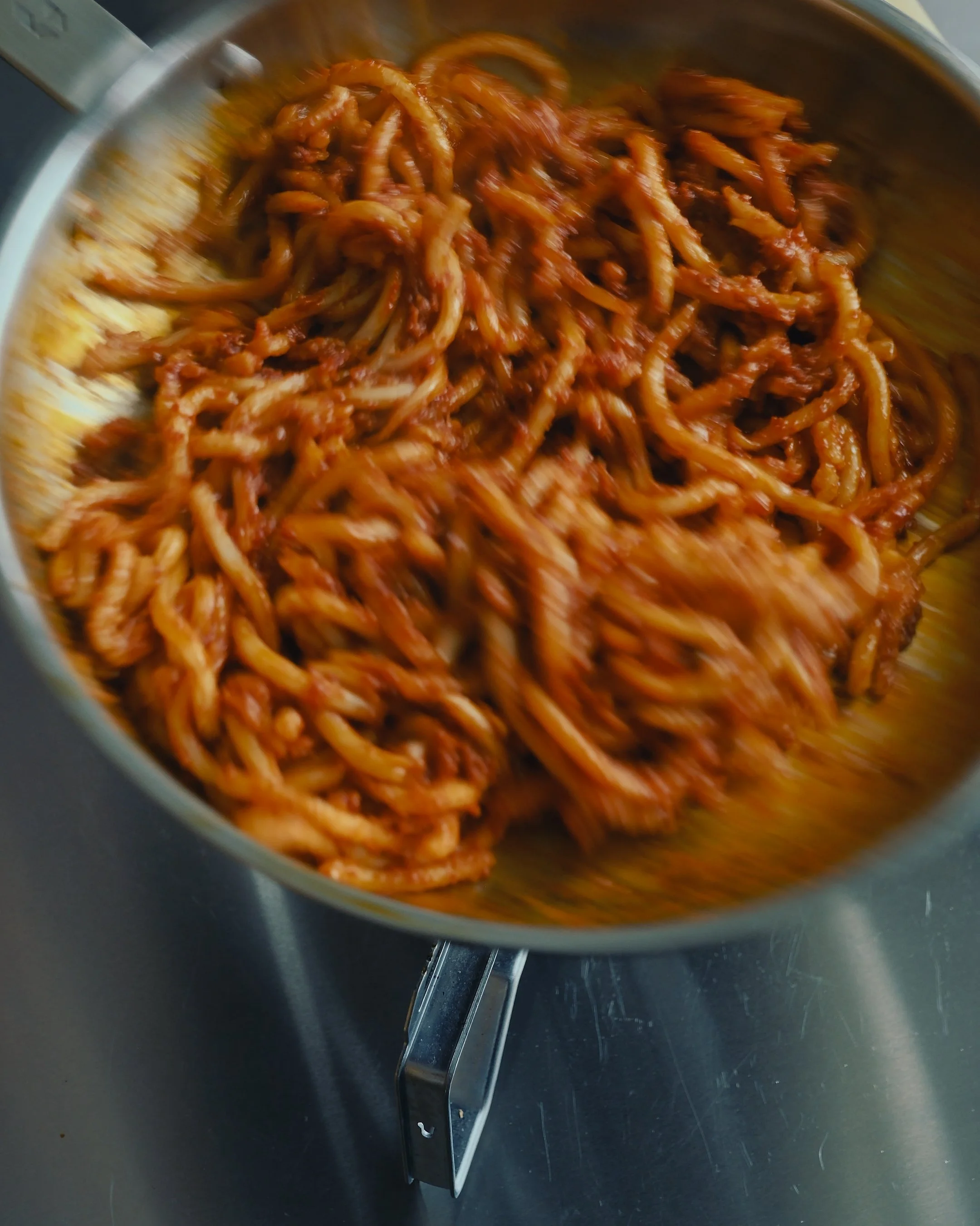 Tomatpuréen blendes med soltørrede tomater, lys miso, honning og hvidløg og steges langsomt på panden, til den bliver mørkere, tættere og let karamelliseret. Den brændte tomatsauce udvikler en koncentreret sødme og en markant umamidybe, hvor misoen giver fylde og balance. Når de forkogte udon nudler steges i olivenolie, får de en let sprød overflade og gyldne kanter, som suger den intense sauce til sig.