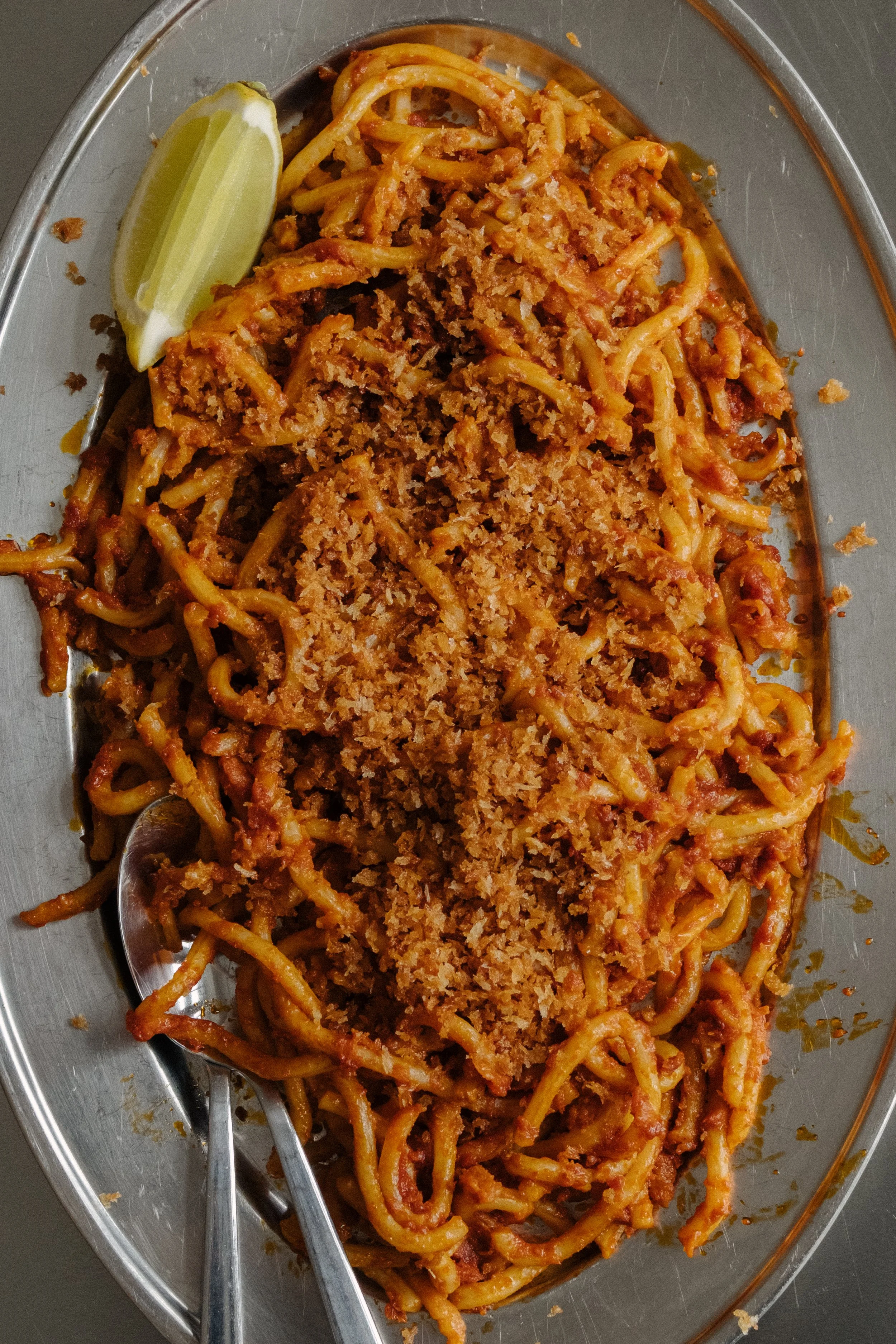 Pangrattatoen – sprødstegt pankorasp i olie fra de soltørrede tomater – tilfører retten tekstur og en nøddeagtig, saltet sprødhed, der bryder den bløde sauce. Et strejf citronsaft til sidst løfter helheden og giver friskhed til den dybe tomatsmag.