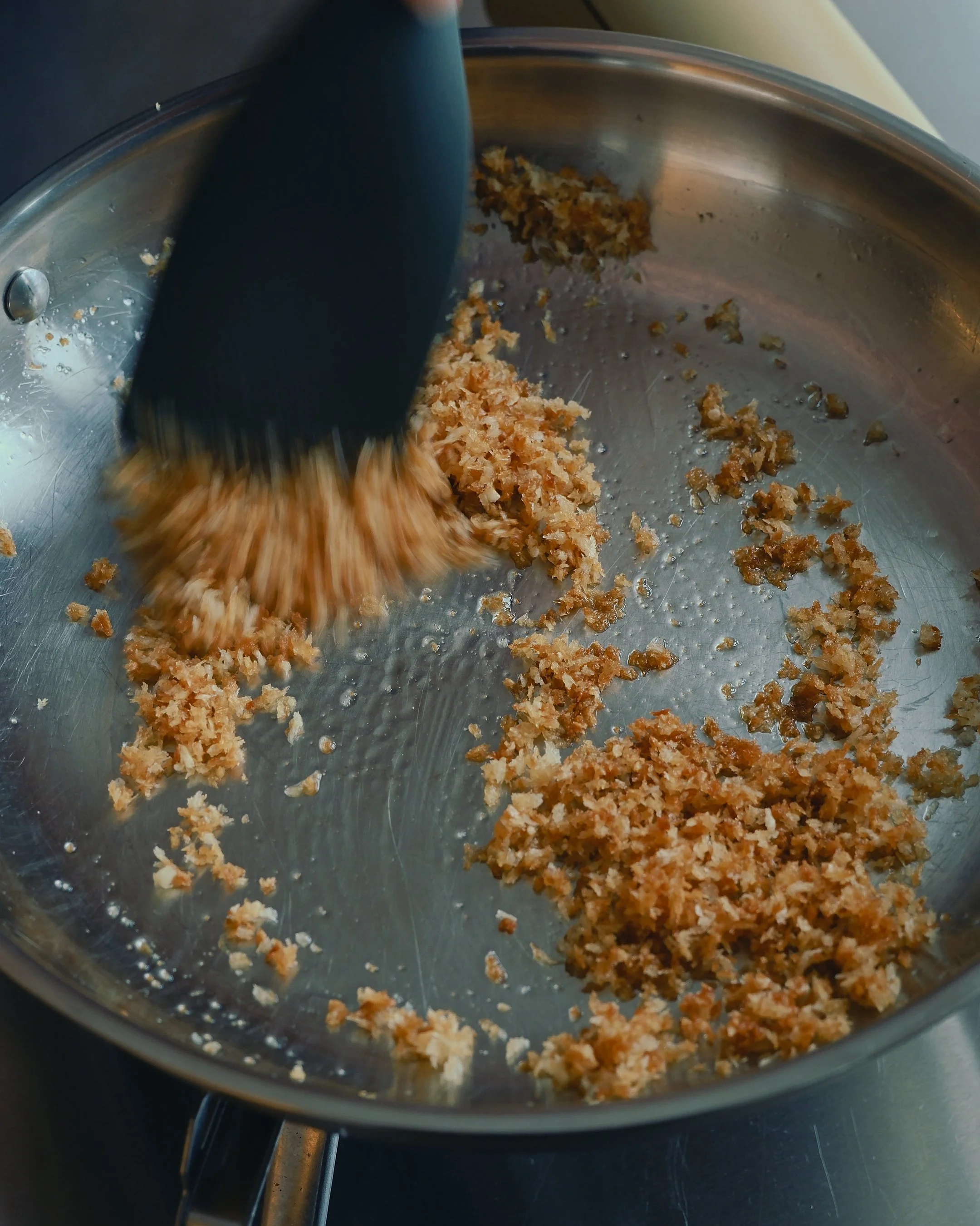 Lav først pangrattatoen. Steg pankoraspen i olien med lidt salt i et par minutter, til det bliver gyldent. Kom det på en tallerken så det kan køle af.