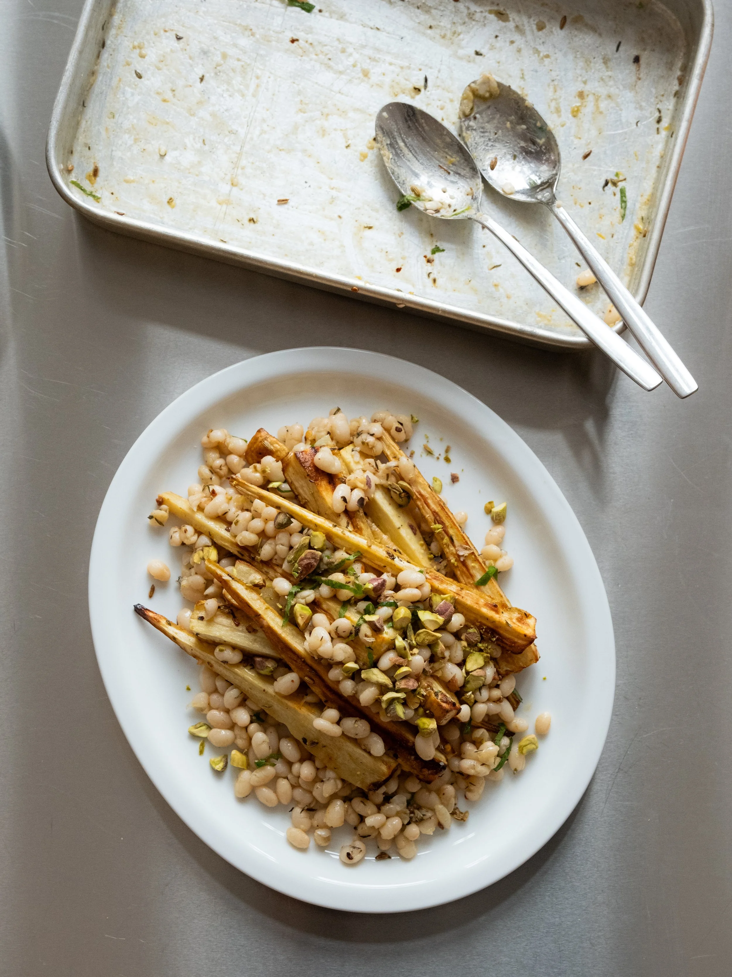 Den her salat med hvide bønner, krydrede bagte pastinakker, pistacienødder og mynte er en enkel, smagfuld og fyldig salat, hvor varme krydderier, sprøde og friske elementer er dejligt afbalanceret. Den fungerer perfekt som tilbehør, men har også struktur og fylde nok til at stå alene som et let måltid.