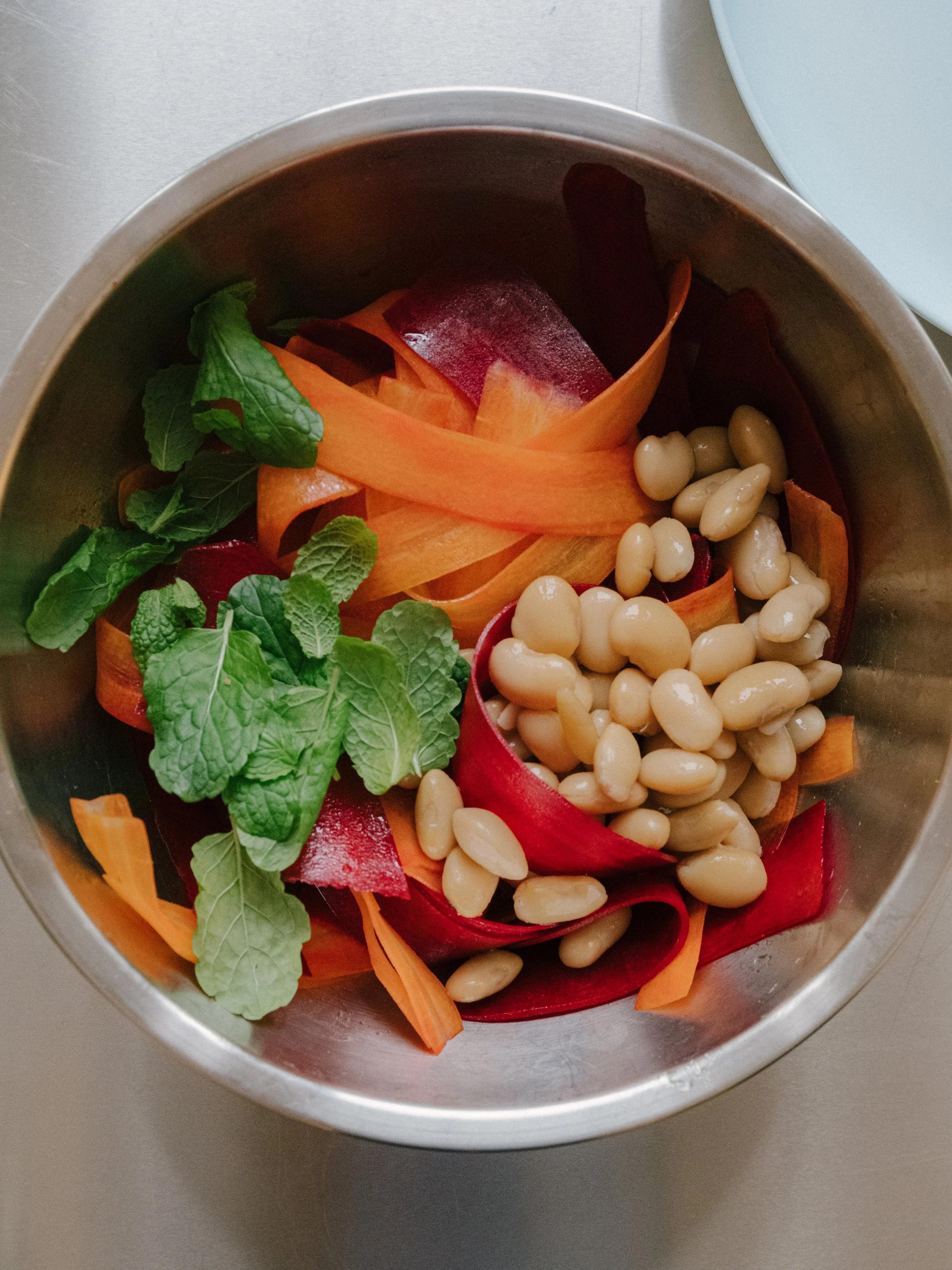 Salat med bredrevet rødbede og gulerod, butterbeans og mynte